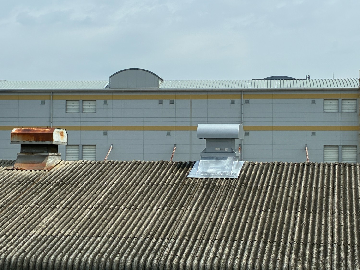 また、ルーフファン取替工事では、単に機器を入れ替えるだけでなく、既設の架台や屋根開口部の状態確認が重要です。工場・倉庫では折板屋根や金属屋根が多く、長年の振動や風雨の影響で歪みや防水材の劣化が進んでいることもあります。そのため、取替工事は設備更新であると同時に、建屋の換気環境全体を見直す機会でもあります。