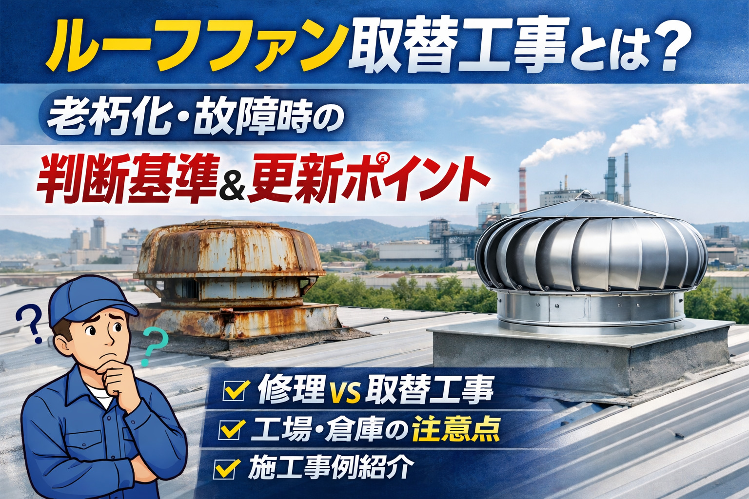 ルーフファンの異音や振動、換気不足にお悩みではありませんか?工場や倉庫では、ルーフファンの老朽化や故障が進むことで、作業環境の悪化や結露、設備トラブルにつながるケースも少なくありません。しかし「修理で対応できるのか」「取替工事が必要なのか」「どのタイミングで更新すべきか」と判断に迷う担当者の方も多いのではないでしょうか。